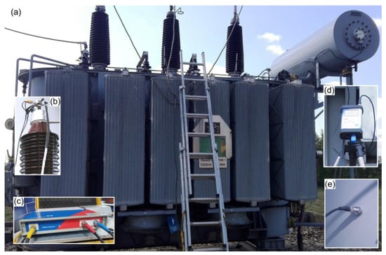 FRA and VM diagnostics on 110/30 kV, 31.5 MVA power transformer: (a) tested transformer, (b) FRA measuring clamp with cables attached to a bushing, (c) FRAnalyzer device, (d) SVAN 958 device, (e) accelerometer with magnet attached to a tank.