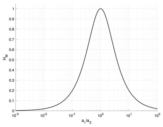 The calculation results are consistent with (7), which, being a dimensionless value, can be treated as a measure of the similarity between two numbers. Figure 2 presents the dependence of the HM value on a1/a2.