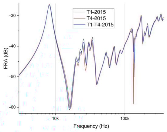 In this approach, all FRQI values are observed to be higher than 0.9; therefore, this value will be regarded as the “warning value” for further analysis. If the results are higher compared to the average group value of healthy units, the transformer should be considered healthy; if lower, there may be some problems with its mechanical integrity within the scope of FRA method detection. A larger population leads to a more reliable assessment. The FRA graph of such an averaged curve, compared to two examples of single pieces of transformer data (T1, the closest to the average, and T4, the farthest from the average), is presented in Figure 3. The curve for T4-2015 shows some differences between 20–30 kHz and then exhibits deeper resonance above 100 kHz. The latter is likely responsible for the lower value of the global FRQI.