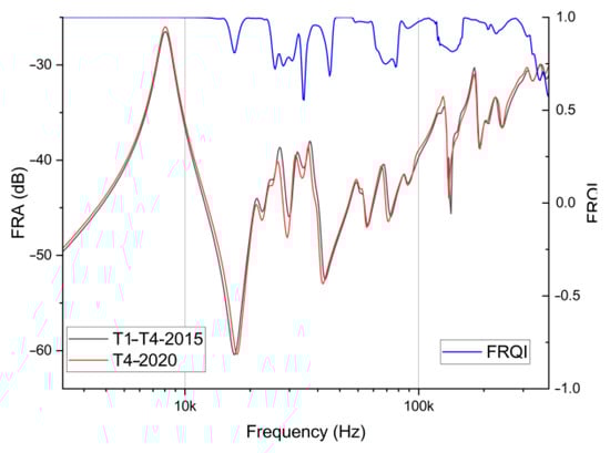 FRA curves for transformer T4 (year 2020) compared to the average values of T1–T4 with the FRQI curve.