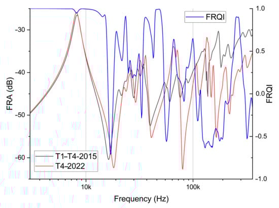 All transformers from this group underwent repeated FR measurements after five years (in 2020), demonstrating good conformity with previously recorded fingerprints. In 2022, transformer T4 was measured again, after being de-energized due to a network event, likely a short-circuit. Its FRA curve exhibited major changes. The FRQI analysis for transformer T4 is presented in Table 3. It was compared to both earlier measurements (2022 vs. 2015 and 2022 vs. 2020) and also to the average value for T1–T4.