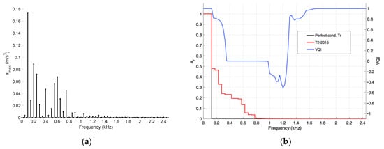 Results of the VM test of an example transformer: (a) frequency amplitude spectrum (amax—vibration acceleration amplitude), (b) curves ar(f) of perfect condition transformer, transformer under analysis, and VQI curve.