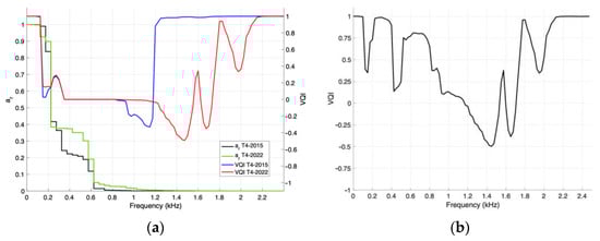 Curves ar(f) and VQI(f) for transformer T4 recorded in 2015 and 2022: (a) ar(f) of transformers T4-2015, ar(f) T4-2022, VQI(f) T4-2015, and VQI(f) T4-2022; (b) curve VQI(f) calculated for ar(f) from year 2015 and 2022 of transformer T4.