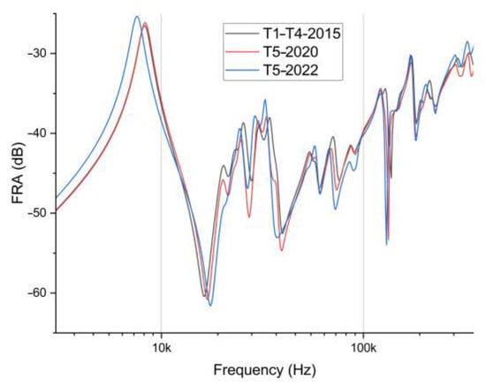 The initial analysis conducted in 2020 revealed that the FRQI for transformer T5 is 0.8635, which is slightly below the assumed warning level of 0.9. At that time, it was unclear whether this discrepancy was due to its mechanical condition or the fact that it was not included in the average used for the assessment in 2015 and might have some constructional differences. Since transformer T5 had no measurements before 2020, there was no fingerprint for comparison. The subsequent measurement in 2022 indicated the development of a defect in the active part, as its FRQI value dropped to 0.6645. All three curves are presented in Figure 9. A visual comparison of these curves reveals that the T5-2022 dataset shifted away from the T5-2020 line and away from the average value. Consequently, the FRQI dropped significantly, demonstrating its sensitivity in such analysis.
