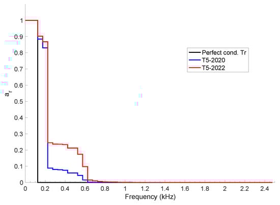 The second stage in diagnosing the T5 unit involves a vibroacoustic examination of the technical condition of the core in 2020 and 2022. In this case, it is less important that the previous mechanical condition of this transformer is unknown. The analysis, similar to that in previous examples, will be based on comparing the ar(f) curve of the tested unit with that of a transformer in perfect condition. It is crucial that the global VQI coefficient is not lower than 0.5465 (the minimum limit value set for the group of transformers in good condition, T1, T2, T3, and T4—as shown in Table 4). Figure 10 depicts the normalized changes in the power spectral density ar(f) of the T5 unit in the years 2020 and 2022.