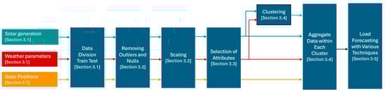The research methodology began with obtaining raw utility data, removing outliers and null values, then processing the data to integrate them into a relational database. To ensure uniformity and precision in the data, the next step was to perform data scaling. Following data scaling, feature analysis and selection of attributes are conducted, serving as key elements of this methodology. Subsequently, K-means clustering was introduced to group the PV sites into different clusters and aggregate the data within each cluster. These preparatory steps laid the foundation to develop the forecasting models. Figure 1 shows the flowchart diagram for the overall methodology and the subsequent sections explain the approach.