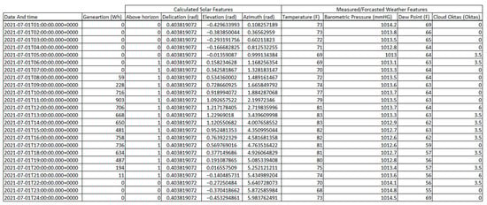 Using the Solar PV site latitude longitude coordinates and formulas provided by the National Oceanic and Atmospheric Administration calculator [], the following features were calculated for each PV site at every hourly timestamp in the data to describe the sun’s position in the sky: