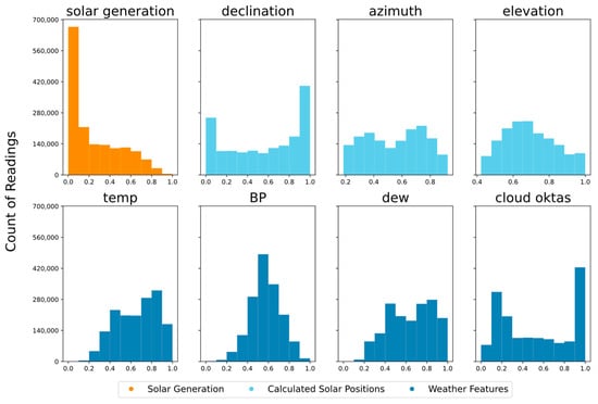 Next, each feature’s data underwent normalization through a min–max scaler, calibrated based on the 2021 training dataset. This normalization process was applied uniformly to both the 2021 training and 2022 testing datasets. In accordance with the utility company’s data security requirements, the target variable, representing load generation within the range of 5–15 MW, was also scaled to align within the 0 to 1 range. This scaling was performed using a min–max scaler fitted to the data from the 2021 training datasets and was consistently applied to both the 2021 training and 2022 testing datasets. A visual representation of the scaled distribution of features and the target variable is presented in Figure 3, where the x axis represents the data scaled between 0 and 1, and the y axis represents the count of readings for a certain scaled data (for example, count of readings for 0.5 scaled data for solar generation).