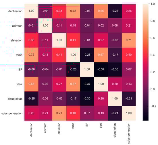 Next, Pearson correlation scores were computed between each feature variable and the target variable within the training dataset, as illustrated in Figure 4. Notably, solar elevation demonstrated the highest correlation to the target variable, registering a coefficient of 0.71. The other two solar features, namely, declination and azimuth angle, exhibited some correlation with the target variable, recording coefficients of 0.26 and 0.21, respectively. Among the measured weather features, the temperature variable displayed a moderate correlation to the target variable, with a coefficient of 0.4. In contrast, cloud oktas revealed a negative correlation score to solar generation of −0.21, indicating that cloud cover has a general effect of lower solar generation. On the other hand, barometric pressure and dew point did not exhibit significant correlations with solar generation, registering coefficients of 0.07 and 0.13, respectively.