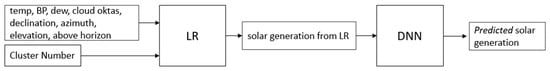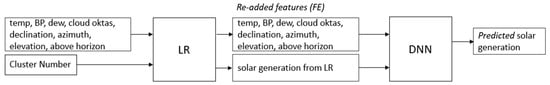 The second model, LR+FE+DNN, also used the output of the linear regression model and re-added features (FE): temperature, BP, dew, cloud oktas, declination, azimuth, elevation, and above horizon as an input parameter to forecast solar generation. The model is represented in Figure 9 and can extend up to 168 hours. Each model used root-mean-square error and mean absolute error and full batch gradient descent to optimize the weights.