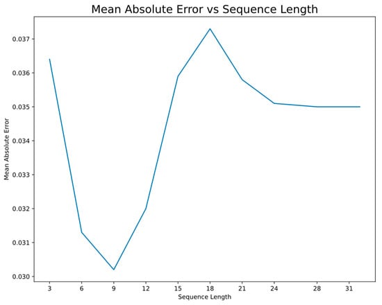 A sequence length of 9 was chosen by comparing the performance of various sequence length during a grid search. As shown in Figure 10, a sequence length of 9 achieved the lowest amount of mean absolute error.