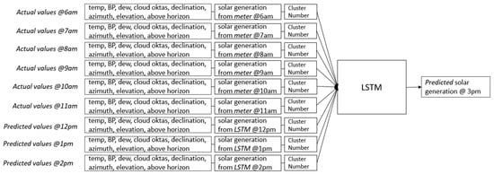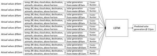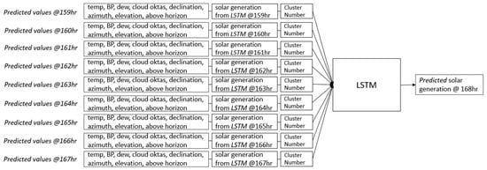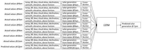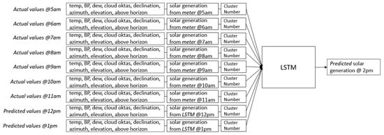 The model has the capability to forecast up to 168 h. To illustrate this, to predict generation at 12 p.m., the model relies on a sequence of nine historical actual values from 3 a.m. to 11 a.m. The features are temp, BP, dew, cloud oktas, declination, azimuth, elevation, above horizon, actual solar generation from the meter, and cluster number. This process is visualized in Figure 11.