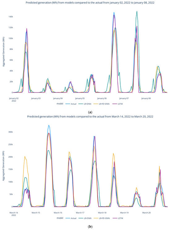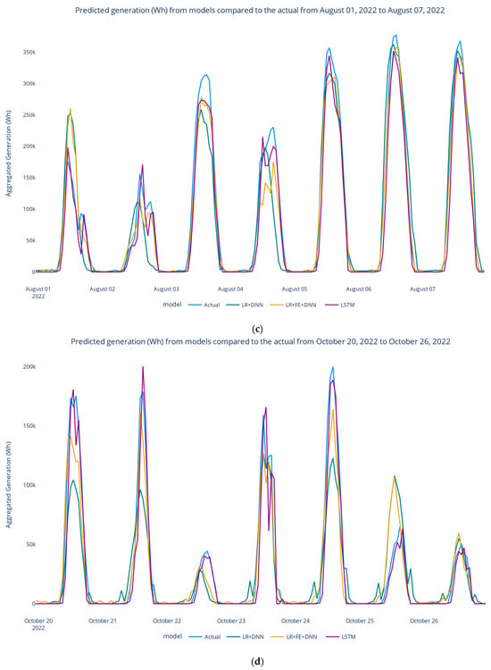 The forecast generation is shown in Figure 16, where (a) shows 168 h in the winter, (b) spring, (c) summer, and (d) fall. Figure 17 provides a detailed view for one day of the predicted solar load generation across all models, while Figure 18 displays it spanning two days. Notably, from Table 3 and Figure 16a–d, the LSTM model, which yielded the lowest performance metrics, closely approximated the actual peak generation values compared with the alternative model. Moreover, the model achieved a better prediction when there was a change in the actual generation load from one day to another, as shown in Figure 16a–d.