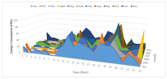 Table 4 shows the total service distance and service numbers, as well as the minimum, average, maximum, and standard deviation of service distances for the three current fire ambulance vehicles over the course of one year. The Opel Vivaro-e EV, capable of traveling up to 230 km on a single charge, exceeds the maximum service distance covered by the current three ambulance vehicles. The average distance for each service is 27.74 km and the energy consumption of the Opel Vivaro-e EV is 0.21 kWh/km; hence, the average energy consumption for each service duty is 5.82 kWh. The oil cost of these three fire ambulance vehicles in one year is NTD 63,340 (2010.8 USD). Figure 2 depicts the cumulative count of returning fire ambulance vehicles per hour for each month, while Figure 3 illustrates the average energy consumption per hour for each month. It is evident that fewer rescue service requests occur before dawn, with a significant increase in emergency service calls during the night.