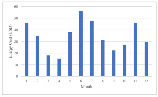 Figure 4 shows the accumulated energy consumption for each month. The electricity cost for each month can be calculated based on the progressive rating for each month shown in Table 1. As scheme 1 does not employ a time-of-use rating system, the energy costs for charging strategies 1 and 2 are identical. Figure 5 illustrates the energy costs associated with these two charging strategies for each month. The total energy cost for one year amounts to NTD 12,986 (USD 412.254).