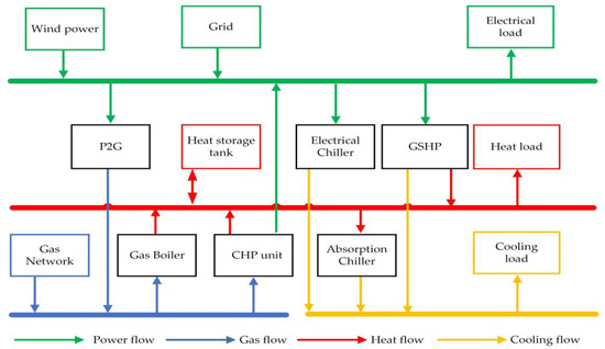 The existing integrated energy system in North China originally contained the following devices: the CHP unit, gas boiler, absorption chiller, electric chiller, and heat storage tank. This study plans to improve the existing system with P2G and GSHP embedded. After that, the improved system can supply electricity, heat, and cooling to the region more flexibly. The energy input into this system is mainly composed of renewable energy and traditional energy, including grid electricity, wind energy, and natural gas. In winter, the CHP unit participates in heating the system by cooperating with the GSHP, gas boiler, and heat storage tank. In summer, the GSHP supplies the system cooling load by cooperating with the absorption chiller and electric chiller. At this time, the GSHP is in its cooling mode, and heating is no longer carried out. In addition, P2G sends surplus natural gas out through the gas network during the period in which the system’s consumption is low. This model of the existing system is similar to the work in Chai et al. [35] and Lu et al. [36]. The structure of the improved system is shown in Figure 1.