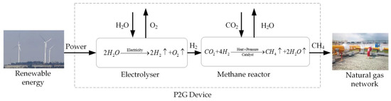 P2G is mainly composed of two parts: an electrolyser and a methane reactor. First, the electrolyser uses the remaining wind energy for electrolysis to obtain hydrogen. Then, the methane reactor generates methane from hydrogen and carbon dioxide via the Sabatier reaction under the action of the catalyst [37,38]. The newly generated methane is supplied to the CHP unit and GB through the natural gas network. The chemical process of P2G is shown in Figure 2.