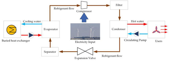 GSHP is a device that uses geothermal energy for heating or cooling through the consumption of electric energy. It is mainly composed of a compressor, condenser, expansion valve, evaporator, and buried heat exchanger [22]. The heating process of GSHP is shown in Figure 3.