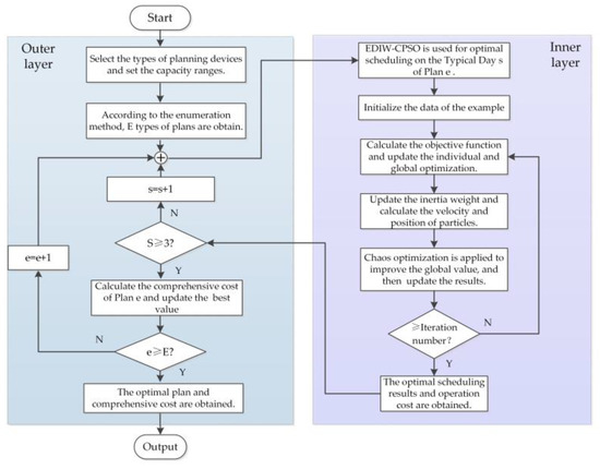 The enumeration method is used to obtain the various capacity schemes in the outer layer. First, consider and set the types of planning devices. Second, set the range of capacity values for each device according to the actual needs of the project. Then, set the device capacity by uniformly and discretely enumerating in the device capacity value space. (For instance, Case 1 intends to plan device A and B by enumerating every 100 kW. Scheme 1: device A 100 kW device B 100 kW. Scheme 2: device A 200 kW device B 100 kW. Scheme 3: device A 300 kW device B 100 kW, and so on). The above process determines E types of capacity schemes. Any capacity scheme obtained by the outer layer serves as the constraint range of device scheduling in the inner layer. Candidate device parameters in different schemes are also the input parameters (optimal device parameters in a certain scheme), which can affect both objective functions in Formulas (18) (inner layer—operation cost) and (15) (outer layer—comprehensive cost). The daily operation cost determined by the inner model is substituted into the outer model to calculate the daily comprehensive cost. In this way, the optimal plan is finally found through the loops and feedback of bi-layer optimization. A flow diagram of the bi-layer model is shown in Figure 4.