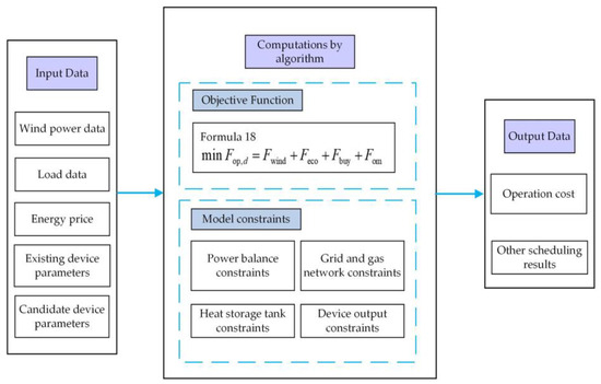 The optimal scheduling framework of the inner-layer model is shown in Figure 5. As the figure shows, the input data include wind power data, load data, energy price, existing device parameters, and candidate device parameters. And the model constraints include power balance constraints, grid and gas network constraints, heat storage tank constraints, and device output constraints. The input data and model constraints form the initial conditions. The objective function is solved using an algorithm. Finally, we obtain the scheduling results.