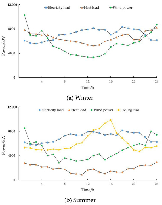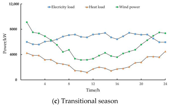 After considering the seasonal differences in regional energy supply, the daily operation of the system can be divided into three typical daily scenarios: typical day of summer, typical day of winter, and typical day of transitional season (S = 3). The number of running days in the transitional season includes spring and autumn days. The curves of cooling, heating, power load, and wind power output on typical days are shown in Figure 6.