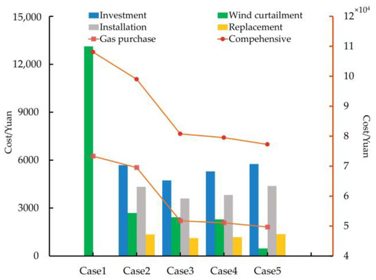 - Among the planning cases, the improved system in case 5 has the highest installation and replacement costs, but the comprehensive cost and the ability to reduce the curtailed wind power are the best. Compared with the original system, the wind curtailment rate, gas purchase cost, operation cost, and comprehensive cost of the optimized system decreased by 18.8%, 32.3%, 33.8%, and 28.5%, respectively.