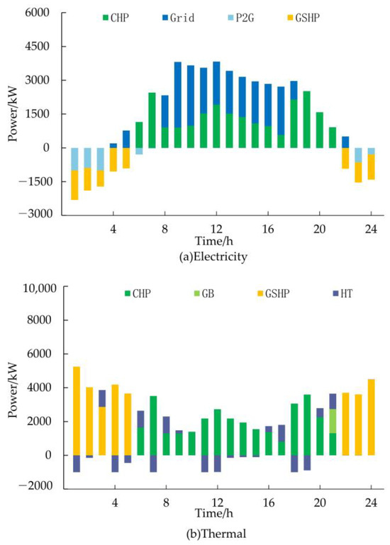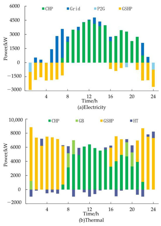 The electrical and thermal outputs of devices in the integrated energy system on a typical day of the transitional season are shown in Figure 10. During the periods of 1–5 and 22–24, the electrical load in the system is almost completely provided by wind power, and the surplus wind energy is converted into other forms of energy by P2G and GSHP. During these periods, as the main heating device, the GSHP cooperates with the heat storage tank to undertake all the heating tasks. During periods 8–18, the demand for electricity is at its peak, and the thermal load is at a low level. The heat generated by the CHP unit can fully meet the thermal load and charge the heat storage tank multiple times. At the same time, the wind power output is relatively low, and the shortage of the electricity load means that there is a need to purchase power from the grid. In addition, the lack of electricity causes P2G and GSHP to stop working.