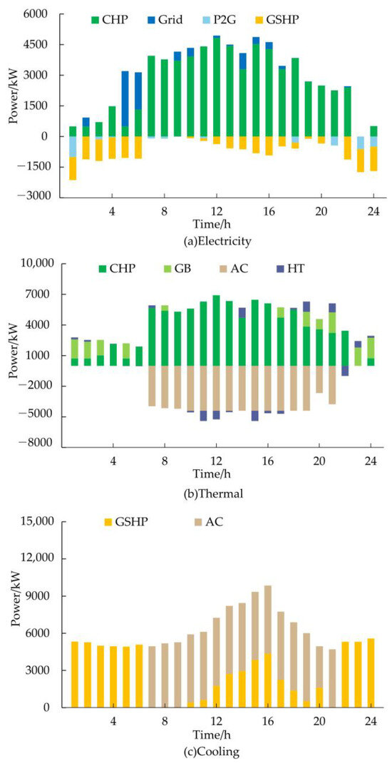 The electrical, thermal, and cooling outputs of devices in the integrated energy system on a typical day of summer are shown in Figure 11. During the periods of 21–24 and 1, part of the redundant wind power in the system is accommodated by P2G, and the other part is accommodated by GSHP (the main cooling supply source). Both of them can optimize the cost effectiveness of system operation and alleviate the curtailed wind power. Almost during the same period, the output of GB is approaching full power because of the imbalance in thermal and electrical loads, which can alleviate the pressure of the CHP unit. During the periods of 7–16, the high purchase price of electricity and the lack of wind power can lead to an increased cooling cost of GSHP. Therefore, the CHP unit has a higher output to prioritize power supply and provides a large amount of heat for absorption refrigeration. Overall, the wind power resources in summer are not as abundant as in winter, which leads to an increase in the number of periods that require more power supply from the CHP unit throughout the day. In addition, it is necessary to purchase electricity from the power grid to achieve power balance.