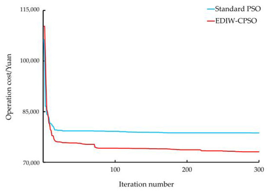 The iterative process of the two algorithms is shown in Figure 12. From the comparison in Figure 12, it can be seen that EDIW-CPSO has a faster convergence speed and better iteration effect compared to the standard PSO algorithm. In addition, the standard PSO algorithm prematurely falls into a local optimum value, while the EDIW-CPSO algorithm can still update the optimum value (maintain the ability to explore) in the later stages of iteration.