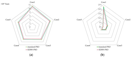 Naturally, the optimal results of the inner-layer model using the standard PSO algorithm will affect the enumeration of the outer-layer model. Based on standard PSO scheduling, the results obtained through bi-layer optimization are shown in Table 8, and there is a comparison in Figure 13. As can be seen from Table 8 and Figure 13, the capacity of all devices is smaller than in previous optimizations, and the wind curtailment rate and comprehensive cost are larger. The above results show that the cost effectiveness of the system under standard PSO scheduling is not as good as that of the EDIW-CPSO due to the inefficient scheduling of devices.