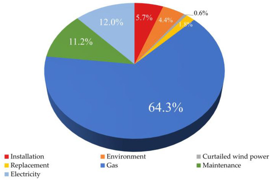 Figure 14 shows the composition of comprehensive cost in case 5. It can be seen from Figure 14 that the gas purchase cost accounts for the largest proportion of the total cost, reaching 64.3%. Therefore, the price of natural gas directly affects the gas purchase cost of the system. In order to analyze the influence of natural gas prices on the comprehensive energy system, this section sets the fluctuation range of natural gas prices as 40%~220%, with a change interval of 30%. The natural gas price in the example is 3.5 CNY/m3, and the other system parameters remain unchanged. The results are shown in Figure 15.