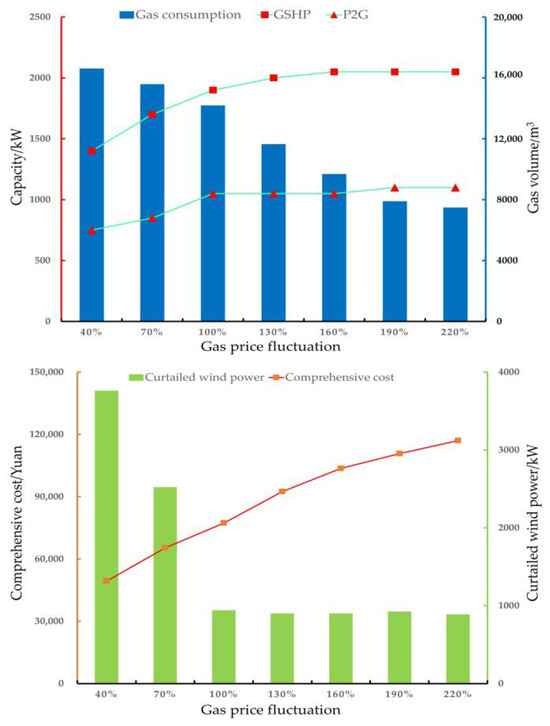 From Figure 15, it can be seen that, in the range of 40% to 130%, as the natural gas price increases, the optimal capacities of P2G and GSHP also gradually increase. In the same range, the gas purchase cost and curtailed wind power decrease. The above results show that the cost effectiveness of the system can be improved by planning the use of these two devices in terms of natural gas price fluctuations. In addition, the configuration capacity of GSHP changes greatly, because it can bring greater benefits by reducing the gas consumption of the CHP unit through decoupling the constraints of ‘power determined by heat’. In the range of 160%~220%, the capacity of P2G changes slowly. This is because P2G can reduce the gas purchase cost, and the amount of the curtailed wind power in the system is already extremely low, so it is no longer economical to continue to expand the capacity of P2G. In the same range, the capacity change in GSHP tends to be stable, because it cannot share the power supply of the CHP unit, which is wasteful in terms of expanding the capacity. Overall, as the natural gas price rises, the amount of gas purchased by the system decreases, the comprehensive cost increases, and the configured capacities and curtailed wind power are gradually stabilized.