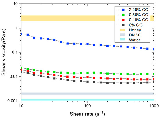 Rheological data demonstrating the effects of different concentrations of GG to MAPI ink with respect to honey, water, and the pure DMSO.