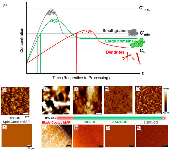 (a) Modified LaMer curve depicting supersaturation rates as a function of precursor concentration in wet films undergoing drying respective to processing time. The red curve represents a case of rapid supersaturation with burst nucleation and little time for crystal growth, which is characteristic of antisolvent-induced crystallization, the green line represents the introduction of an optimized amount of GG, whereby burst nucleation occurs at a lower degree of supersaturation, thus allowing more time for crystal growth which yields larger domains, and the grey line represents a case where fewer stable nucleates form, leading to extended crystal growth on available sites resulting in a void-filled dendritic structure; (b) AFM image of fine-grained MAPI spin-coated with an antisolvent in a nitrogen glovebox; (c–f) AFM images of ambient blade-coated samples with increasing amounts of GG from unmodified to 2.29%, showing the change in morphology from variable dendrites to homogeneous domains as suggested by the LaMer curve; (g–k) Corresponding transmission optical microscopy images of (b–f) further demonstrating the uniformity and changes in morphology enabled by GG. All transmission images were captured with the same lighting conditions.