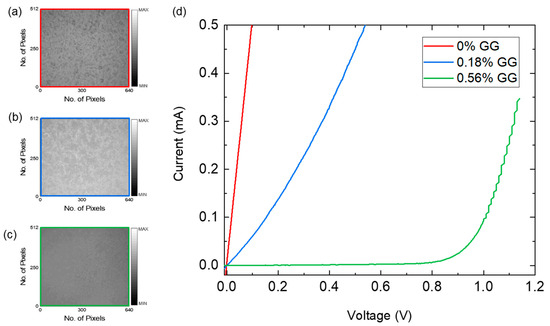(a–c) Illuminated lock-in thermal topography images of 0%, 0.18%, and 0.56% GG with scale bar indicating minimum temperature as dark spot and maximum temperature as bright spot, all the images have a common scale of 4.6 µm per pixel; (d) I–V response of the blade coated thin films on ITO glass with 0% and 0.18% GG samples showing poor response versus 0.56% GG.