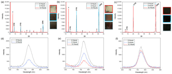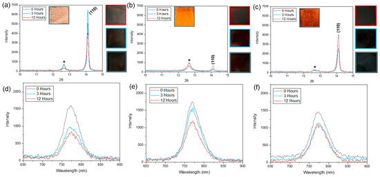 Next, we tested the effects of GG inclusion on the operational stability of MAPI films. X-ray diffraction spectrums and photoluminescent data were collected for unencapsulated MAPI blade-coated samples after humidity (25C, 85% RH in an environmental test chamber) or heat aging (85C in a vacuum oven as to avoid humidity-based degradation) initially and after three hours and 12 h, as shown in Figure 4 and Figure 5, in which grey correlates to as-coated films before testing, blue to samples after 3 h of testing, and red for samples after 12 h of cumulative testing. Figure 4a–c indicates the effects of aging in humid air for 12 cumulative hours with both 0% GG (Figure 4a) and 0.18% GG (Figure 4b) featuring a near-complete elimination of characteristic perovskite peaks coupled with an increase in peaks associated with lead iodide. This crystallographic evidence suggests the volatilization of the methylammonium cation, possibly as a means of stress relaxation, and PL data in Figure 4d,e confirms the near-complete loss of the black photoreactive phase after 12 h, as seen in the optical images alongside Figure 4a,b. In contrast, at an optimized concentration of the polymeric additive, 0.56% GG, the film retains its characteristic perovskite peaks and black phase (Figure 4c) while suppressing excessive lead iodide formation with notably improved retention of the photoreactive phase after 12 h of moisture exposure (Figure 4f). This improvement against humidity can likely be attributed to the improved film uniformity and morphology made possible by the alterations in film crystallization induced by the addition of the GG, and this evidence further points towards an induced beneficial compressive stress inherent to the film.