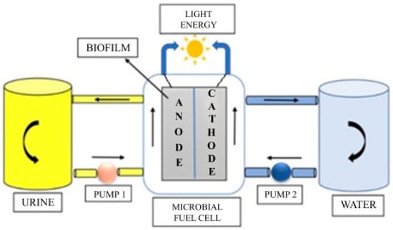 A microbial fuel cell (MFC) is a type of biochemical system wherein electroactive bacteria, acting as a biocatalyst, convert the chemical energy stored in organic matter into electrical energy [22,23]. The bioelectrochemical processes involve the microbial oxidation of organic matter (electron donor) in an anodic chamber and electron acceptance in a cathodic chamber [24]. In this process, the anode stream can contain various types of waste (like food waste, soil and sediments, household waste, agricultural waste streams, and municipal wastewater streams) that can be used as a substrate [25,26]. Figure 1 shows a typical schematic of a microbial fuel cell, while Figure 2 shows the feasibility of a microbial fuel cell using mammalian urine as an energy stream for the bioelectrochemical process. In Figure 1, the protons released from microbial metabolic processes are transferred to the electron acceptor via a proton exchange membrane, while electrons are conducted through the anodic conductor to the cathode through an external circuit.