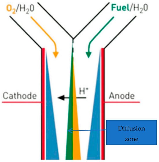 Membranes, used as separators in MFCs, are the primary requirement for optimal electrochemical and microbiological performance in such systems [9]. However, membrane drying, fuel crossover, fuel cell flooding, and anode catalyst poisoning are some of the problems associated with membrane-aided MFCs, which have been identified using electrochemical impedance spectroscopy (EIS) [41]. In addition, in fuel cells, there are two types of power loss: one is dominated by the electrical resistance between the electrodes, which is called leak resistance, and the other is dominated by mass diffusion between the anode and cathode, called crossover, which occurs via membranes. To optimize the performance, a microfluidic microbial fuel cell was designed to maximize the surface-to-volume ratios and minimize the internal resistance, leading to improved use via greener energy options. Therefore, microfluidic microbial fuel cells have emerged as attractive options [39,42,43,44]. Such devices are characterized by the laminar flow of fuel and oxidant streams, which eradicates the use of membranes for proton diffusion. These membraneless microfluidic devices have found uses in wastewater treatment [45] and electricity generation [46], and the modeling of a membraneless single-chamber microbial fuel cell with molasses as an energy source has been described by Sirinutsomboon [47]. Wang and Su (2013) [48] have also reported a membraneless microfluidic microbial fuel cell for the rapid detection of the electrochemical activity of microorganisms. They demonstrated experimentally that a membraneless MMFC was capable of identifying the electric potential resulting from the imbalanced compositions between two streams and from the electrochemical activity of microbial biofilms. Figure 3 shows a Y-shaped version of this.