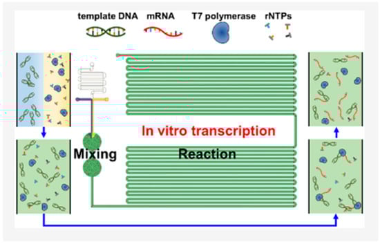 Microfluidic mixing techniques are versatile and facile alternatives to improve the reproducible production of pharmaceutics on one hand and to mimic a complex cellular microenvironment on the other in biological systems [36]. In such systems, mixing can be active and passive based on the operational mechanism, where external forces can be utilized to perform the active mixing of fluids in the microdomain. Moreover, the mixing of fluids in such microfluidic systems can be difficult because of the lamina-dominated flow regime, causing diffusive mixing to predominate [82]. Microfluidic platforms have been explored to manipulate cells and particles in biological systems for the distribution of chemical and biological species. In DNA research [83], numerous biochemical assays in multiplex systems and microarrays require the reagents/samples to be carried in contact with the functionalized surface for proper wells. In addition, based on this platform, chemical species can be separated physically from a multispecies mixture to analyze each component of the mixer, and the individual species can be purified (Vicente et al., 2020) [84]. In the research work of Choi et al. (2023) [85], a new type of microfluidic bioreactor with fibrous micromixers for ingredient mixing and a long macrochannel for the in vitro transcription reaction was successfully fabricated for the continuous production of mRNA. The diameter of the fibrous microchannels in the micromixers was tuned by using an electrospun microfibrous disc with different microfiber diameters. The research work demonstrated that the continuous reaction in the microfluidic bioreactor with efficient mixing performance could serve as a powerful platform for various microfluidic reactions, with mixing efficiency of 95% (see Figure 5).