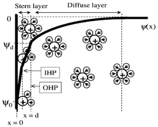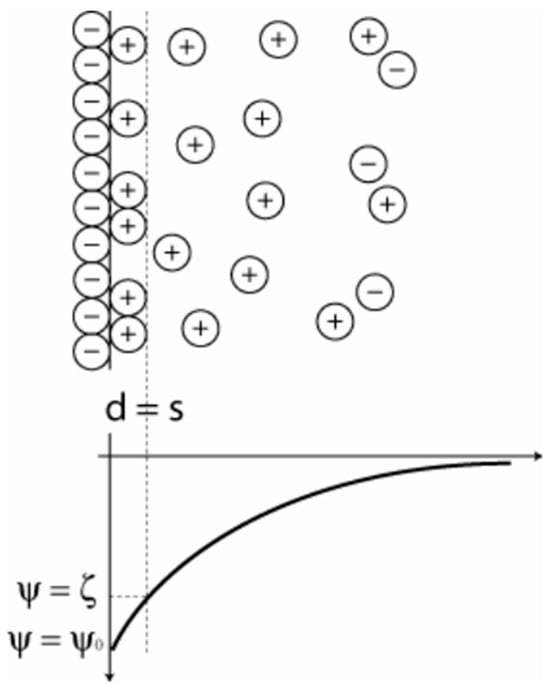 Following the dissociation reactions described by Equations (9) and (10), counter-ions in the electrolyte solution adsorb on the ionized surfaces, with co-ions being attracted to the counter-ion layer. Under these conditions, an electric double layer evolves, having a diffuse layer (see Figure 6). For such a system, to calculate the surface potential and surface charge density, the mean field theory of Poisson–Boltzmann approximation [91,92,93] provides a theoretical approach to determining the potential distribution within the electric double layer.