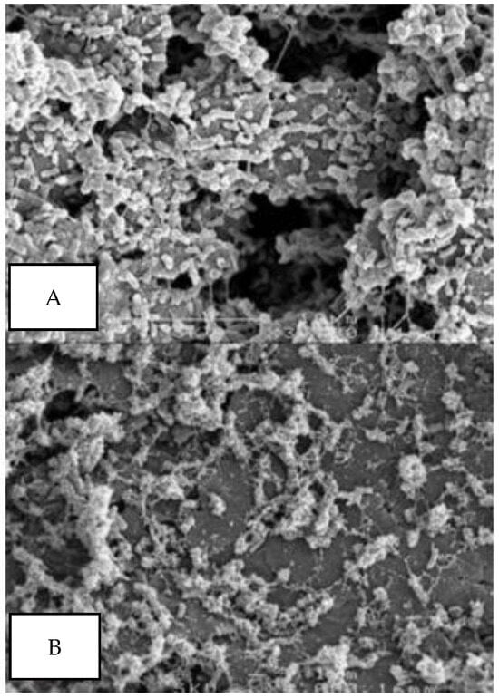 Scanning electron microscope images of P. aeruginosa biofilms at (A) 72 h (3000×) and (B) 144 h (3000×) in continuous mode (Read et al., 2010) [95].