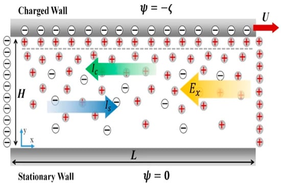 The phenomena of the streaming potential and streaming current occur due to the charge displacement in the EDL caused by an external driving force displacing the liquid phase tangentially against the solid at the solid–liquid interface [121]. Consequently, the counter-ions in the diffusive part of the EDL are carried downstream in response to a pressure gradient. The resulting streaming current results from the pressure-driven flow direction of the electrolyte solution. The process generates a streaming potential φ, corresponding to the streaming current. The flow-induced streaming potential causes the counter-ions in the mobile part of the EDL to move in the direction opposite to the streaming current, causing the opposite-directional flow of ions to generate a conduction current in the Stern layer. The net effect is a reduced flow rate in the direction of the pressure drop, referred to as the electroviscous effect [122,123]. The accumulation of ions sets up an electric field Ez with the streaming potential difference φ. This field causes the conduction current to flow back in the opposite direction. At a steady state, the net current should be zero [124,125]. The following Figure 10 summarizes the schematics of the hydrodynamic regime in the presence of the electric double layer.