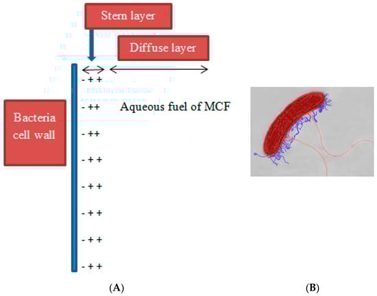The surface of a bacterial cell with carboxyl and amine base groups with number densities per unit area N1 and N2, respectively, and Ka1 and Ka2, respectively, have a fixed surface charge density [104]. For a typical electric double layer characteristic of a microbial system, Figure 9 shows a schematic of the distribution of ions and the associated potential near a charged microbial surface, based on the Stern–Grahame model [105].