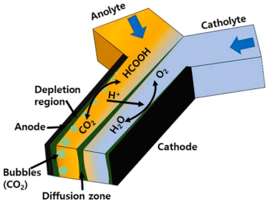 Miniaturization technology has paved the way for the integration of sensors that can monitor and translate observed conditions, such as light levels, acceleration, pressure, or temperature, into a signal at the micro level. The signal can then be transmitted and processed through a system or stored as data [1]. Motivated by this technology, MFCs can be classified by their device size as macro, meso, and micro [2]. In this regard, a microfluidic microbial fuel cell (MFC) is defined as a miniaturized MFC with a total cell volume in the range of 1–200 μL [3]. For such systems, a membraneless microfluidic microbial fuel cell, evolving from a microfluidic microbial fuel cell (MMFC), utilizes colaminar flow to separate anolyte and catholyte streams based on a chosen electrode system. The colaminar flow [4] of the two streams inside the microfluidic channel is the impetus for the enhanced diffusion and transfer of protons from the anode to the cathode. In the microfluidic literature, several studies have been conducted to advance knowledge of its design, construction, and performance. For instance, Ye et al. (2013) [4] have demonstrated that the membraneless MMFC (MMMFC) performance initially increases and then decreases with an increasing influent chemical oxygen demand concentration and anolyte flow rate, while reporting a peak power density of ±618 mWm−2. The highest-performing membraneless microfluidic microbial fuel cell (MFC) to date has been presented by Amirdehi et al. (2020) [5]. The system consists of a strictly anaerobic environment and robust graphite electrodes with optimized placement that prevents cross-contamination between electrode compartments [5]. Uria et al. (2017) [6] found that direct electron transfer MFCs showed the best performance, while concluding that biofilms are the major contributors to current production in such systems. The work of Rizvandi and Yesilyurt (2019) [7] considers aspects of hydrodynamics based on the classical Navier–Stokes equation, mass transfer formulations based on Fick’s law [8], and the kinetics of oxidation at the anode.