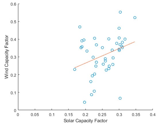 Expanding upon the scatter plot presented in Figure 1, which illustrates the relationship between solar and wind capacity factors, a linear trend emerges, indicating a general correlation between the two variables. Countries with poorer solar power conditions tend to exhibit lower wind capacity factors, and vice versa. Out of the 42 countries, 3 countries had a less than 0.1 wind capacity factor and 2 of them had a solar capacity factor under 0.22. This observation underscores the interconnectedness of solar and wind resources and emphasizes the importance of considering multiple energy sources in energy planning and policy formulation.