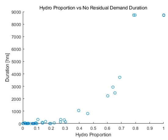 Hydroelectricity proportion of each country vs. no residual demand duration for scenario 3.