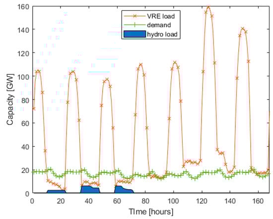 The normalized demand had the electricity generated from VREs subtracted on an hourly basis. The VRE generation proportion was set as 30, 50, or 70% depending on the scenario. The ratio between solar and wind is 1:1 in scenarios 1 to 3 and altered to 0.333:0.666 and vice versa in scenarios 4 and 5. The total VRE capacity is given an initial guess and then iterated to match the generation proportion. The subtraction of VRE load from demand leaves the residual demand, which must be managed by load-following sources.