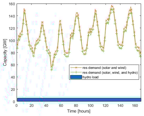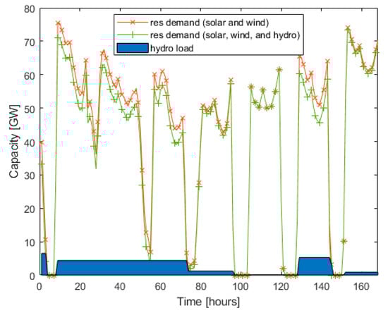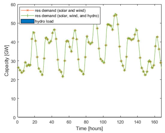 Hydropower plants and PHS plants can assist in flattening the residual demand by operating only when the ramp rate of the load-following source, which represents the change in residual demand over time, exceeds a certain threshold. This approach reduces the maximum ramp rate, enabling less flexible load-following sources to contribute more effectively. In Section 4, the residual demand will refer to the residual demand after the subtraction of solar, wind, and hydroelectricity.