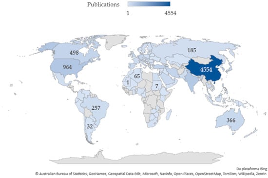 Figure 1 illustrates a comprehensive overview of global research publications on hydrogen production, showcasing the contributions of various countries to this pivotal field of study. The data presented in the figure span from 2018 to 2022, reflecting the global landscape of scientific production during this period. Notably, China emerges as the frontrunner, with an impressive 4554 publications, underscoring its significant commitment to advancing hydrogen production technologies. Following closely, the United States has produced 964 publications, highlighting its robust research ecosystem in this domain. India, South Korea, Turkey, Iran, and Canada also demonstrate substantial engagement, with 843, 724, 546, 505, and 498 publications, respectively.