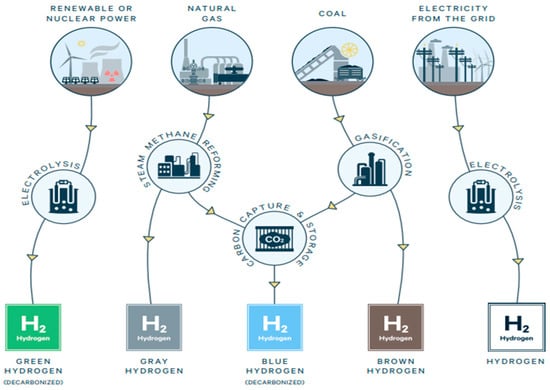 There are five main forms of hydrogen production [16,17], as shown in Figure 2. Green hydrogen is produced from electrolysis using renewable electricity generation sources. Gray hydrogen is produced from steam methane reforming. Blue hydrogen is produced using fossil sources utilizing capture and storage of CO2 techniques [18]. Brown hydrogen is produced by coal gasification. White hydrogen consists of the electrolysis of water using electricity generated from different energy sources [16].